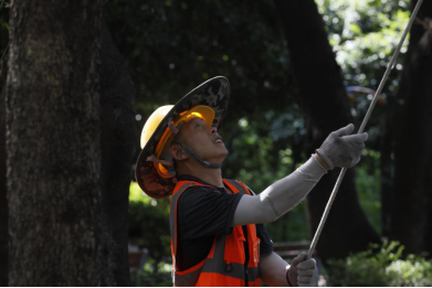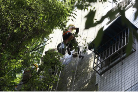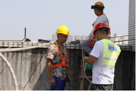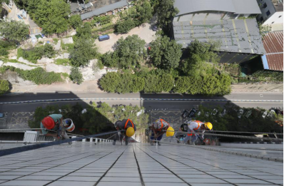 10:16,另一棟樓的天臺,經(jīng)過連日的高溫烘烤,難得的庇蔭處也燥熱難耐。安全監(jiān)督員小陳仔細檢查每一條承重吊繩的卡扣是否牢固,反復(fù)測試安全鎖的鎖止力度。他介紹到,“高溫會加速金屬部件氧化,每一個卡扣都可能成為生命線的關(guān)鍵節(jié)點!辈贿h處,老趙踩著木梯微微前傾,將電鎬穩(wěn)穩(wěn)遞向空中,小費伸手接過時,手柄上早已覆上一層細密的汗珠。兩人的目光在高差中交換,像是完成了一個無需言說的暗號。全員互道“就緒”的話音剛落,“蜘蛛人”小分隊便抓牢繩索,伴著輕微的滑輪轉(zhuǎn)動聲緩緩下降,正式開啟他們今天的第二輪作業(yè)。