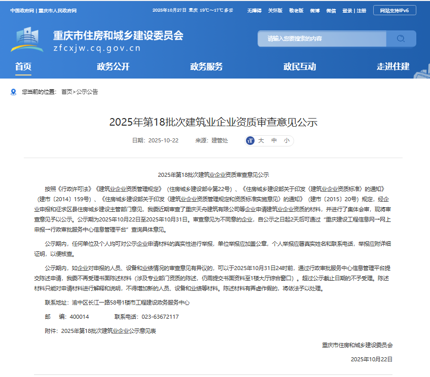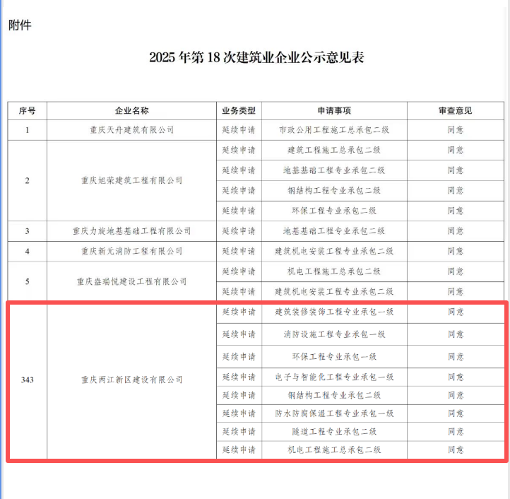 近日,重慶市住房和城鄉(xiāng)建設(shè)委員會(huì)正式發(fā)布《2025年第18批次建筑業(yè)企業(yè)資質(zhì)審查意見公示》,重慶兩江新區(qū)建設(shè)有限公司申報(bào)的建筑業(yè)企業(yè)資質(zhì)已通過市級(jí)主管部門的嚴(yán)格審查,進(jìn)入公示階段。